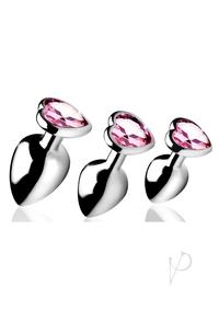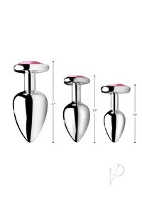 When love is in the air, adorn your derriere! These heart-shaped plugs are simultaneously sweet and sexy. Three different plug sizes allow you to take anal play at your own pace, or choose based on what you are in the mood for! Pop in each sleek plug to appreciate the comfortable weight inside your body, thanks to the nickel-free aluminum alloy material. Great for temperature play, you can warm or cool them in water before insertion. The sparkling charm at the base will be a romantic and exciting surprise for your partner when you bend over. Use with any lubricant of your choosing and clean after use with mild soap or toy cleaner.Measurements:Small plug is 2.6 inches in total length, 2.4 inches insertable length, 1 inch at widest diameter, .4 inches in diameter at stem. (Circumference 3.14)Medium plug is 3.2 inches in total length, 3 inches insertable length, 1.3 inches at widest diameter, .45 inches in diameter at stem. (Circumference 4.084)Large plug is 3.8 inches in total length, 3.4 inches insertable length, 1.6 inches at widest diameter, .48 inches in diameter at stem. (Circumference 5.026)Material: Aluminum Alloy, ABS PlasticColor: PinkNote: Includes 3 plugs