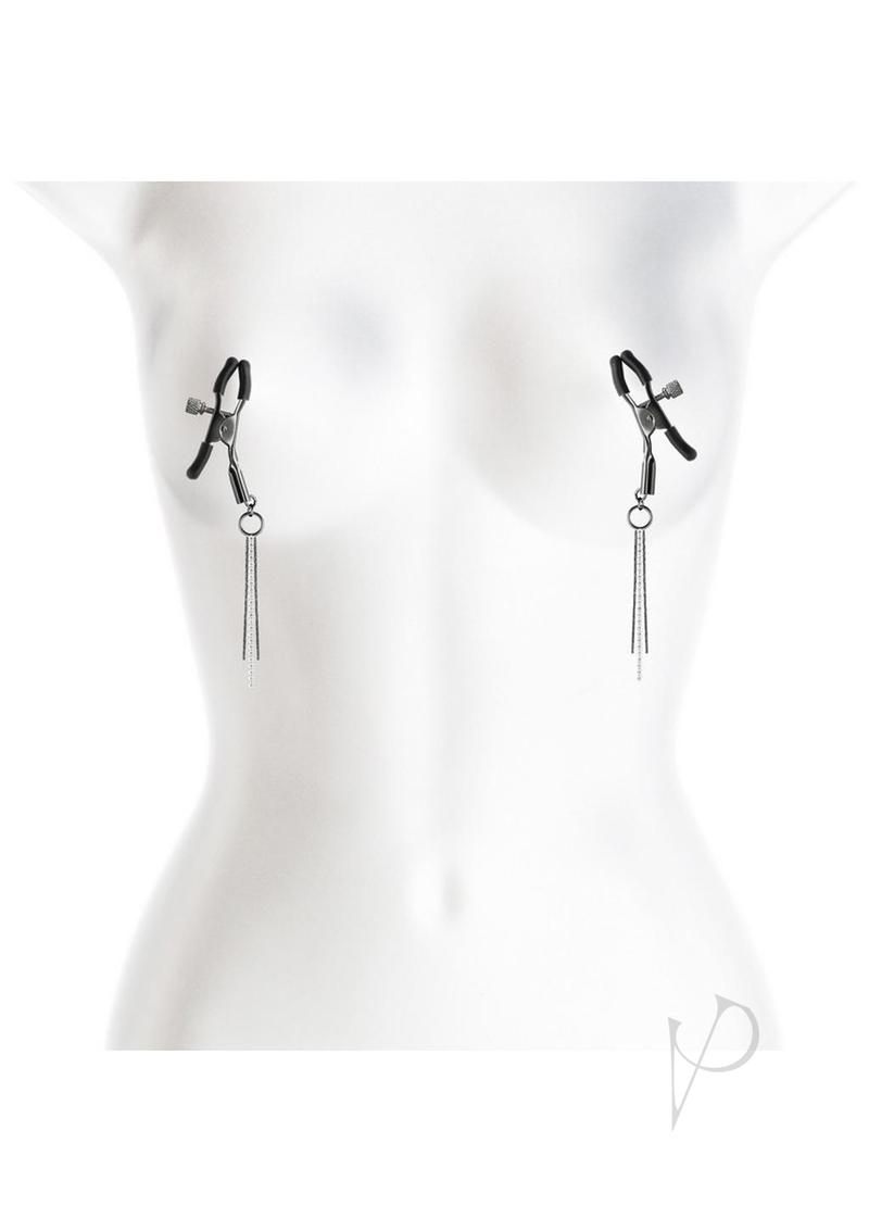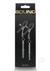 Bound Adjustable Nipple Clamps are for erotic and stimulating sensations. Made from nickel-free metal, Bound`s clamps feature silicone tips for a better comfort and fit. Dangling chains and rhinestones.
