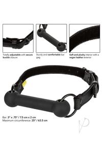 Firm and pliable, body-safe silicone bar gag. Fully adjustable with secure buckle closure. Soft and plushy interior with a vegan leather exterior. Double padded, double stitched. Functional, durable and textured design.