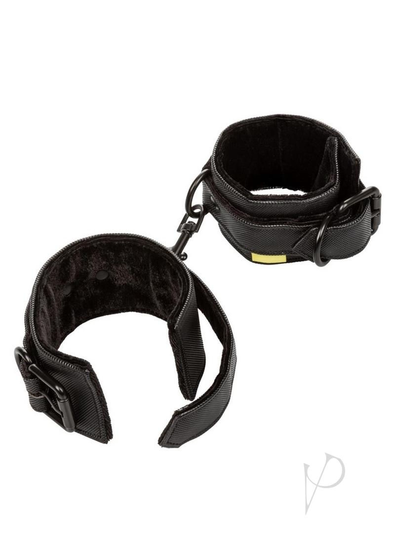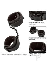 Totally adjustable wrist cuffs with secure buckle closures. Universal clasps and D-rings with swivel design for full dexterity. Soft and plushy interior with a vegan leather exterior. Double padded, double stitched. Functional, durable and textured design.