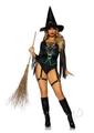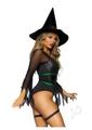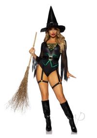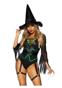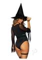 2 Pc Broomstick Babe, Includes Bodysuit With Lace Up Deep-V And Waist Cincher Buckle Accent, Attached Garters, And Witch Hat. SMALL BLACK