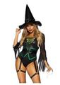 Leg Avenue Broomstick Babe Bodysuit with Lace Up Deep-V and Waist Cincher Buckle Accent, Attached Garters, and Witch Hat (2 Piece) – Small – Black