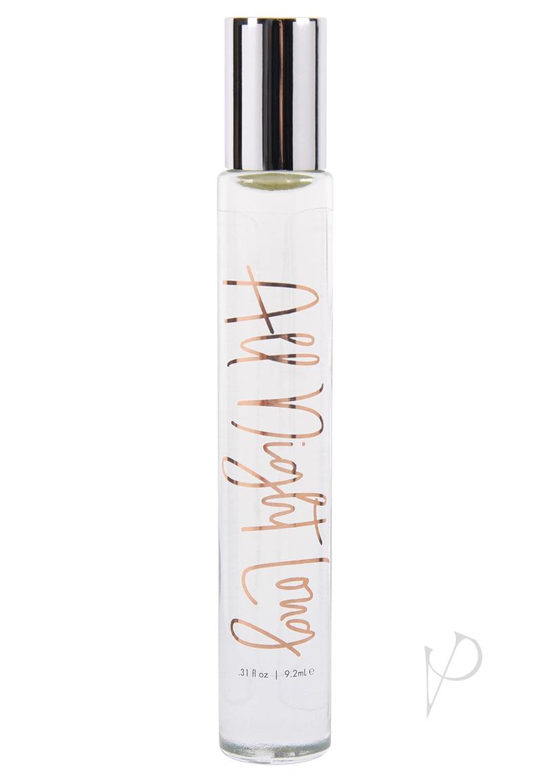 Get ready to go All Night Long with this deeply arousing pheromone infused perfume. The soft-oriental fragrance is a commanding blend of orange and peony blossom, with a subtle touch of black rose and a rich medley of vanilla and woody amber. Ideal for turning heads on a special night out or an intimate evening in for two.Top Notes: Orange, raspberry and peony. Middle Notes: Tropical orchid, lychee and black rose. Base Notes: Dry notes of sweet amber, caramel, vanilla and woody amber. Enhances natural pheromone production to boost sex appeal. Formula blends with skin pH to release a unique one-of-a-kind scent. Bottle has a roll-on applicator and is the perfect size for popping in your purse. Paraben Free. Gluten Free. This product is not tested on animals.