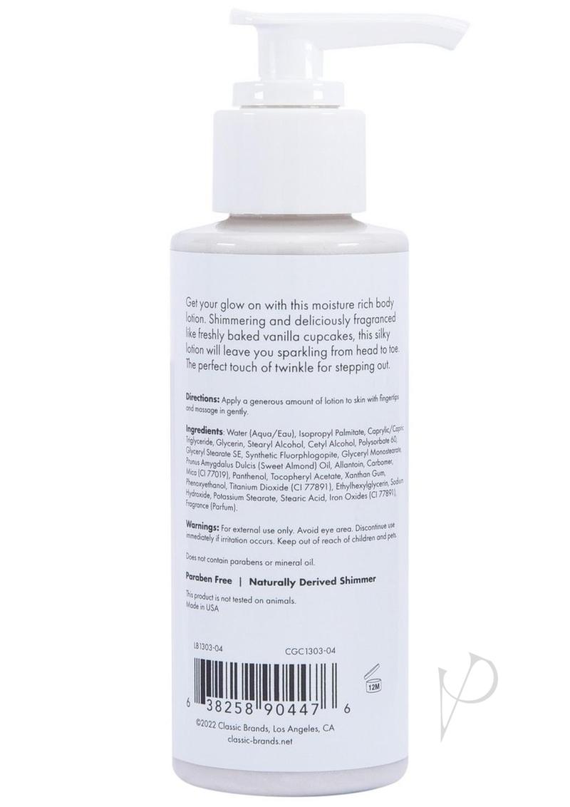 Sweet vanilla and mouth watering butter cream. Get your glow on with this moisture rich body lotion. Shimmering and deliciously fragranced like freshly baked vanilla cupcakes, this silky lotion will leave you sparkling from head to toe. The perfect touch of twinkle for stepping out. Apply a generous amount of lotion to the skin with fingertips and massage in gently.