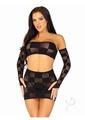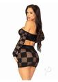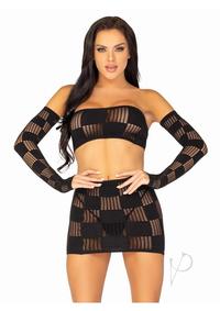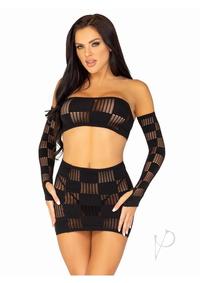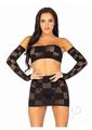 3 Pc Checkerboard Net And Opaque Bandeau, Mini Skirt, And Arm Warmers. Black O/S