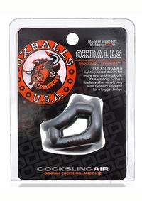 COCKSLINGAIR cocksling by Oxballs FlextprOur original COCKSLING but lesslighter, less bulkya 3-ring open cock and ball sling that fits your bone.Oxballs invented the cocksling, COCKSLING AIR is a lighter, pared down version with less bulk but the same grippy bulge making ability. It`s a c-ring + a ballstretcher + a shaft ring that adds squeeze for a bigger bulge.andnbsp; Slings wrap the base of the shaft and balls for 360 grip that doesn`t pinch or dig.andnbsp;COCKSLING AIR can be worn longer that c-rings and Oxballs invented cockslings, so we make them fit and feel right.andnbsp; Less bulk more fun!Made of our amazing stretchy-strong Flextpr, so much stretch it works for any size guyit stretches 8X it`s size and snaps back for a perfect fit and the colors are shiny and lush.Our original COCKSLING but less bulk, more air, more gripCOCKSLING AIR fits and feels amazing, its wraps ALL your junkMade of super stretchy Flextpr to fit any size guyOur new saturated colors for real lush color popOxballs invented the cocksling, COCKSLING AIR is the most with less!All original design copyright OXBALLSFlextpr our own super-stretchy, strong blendthe right grip that doesn`t pinch. Phthalate free and no scent.LUBE SAFE: Water-based lube, hybrid or silicone lube recommended.andnbsp; Oil-base lubes not recommended.CARE:andnbsp; Wash after use in warm soapy water, air dry.andnbsp; Store toys separately:andnbsp; we recommend storing in breathable cloth pouches or for larger toys, in cotton socks.Made in Chinaandnbsp;SIZE/DIMENSIONS AND WEIGHT:COCKSLINGAIRWidth: 2/51mmHeight: 1.75/45mmandnbsp;andnbsp;andnbsp;andnbsp;andnbsp;andnbsp;andnbsp;andnbsp; Depth: 2-3.75/51mm-95mmCockring hole diameter: 1.25/32mmShaft hole diameter: 1.25-1.5/32-39mmBall hole diameter: .75-1/20-26mmWeight: 1.1 ounces/.03 kilogramsandnbsp;PACKAGING SIZE/DIMENSIONS+WEIGHT:Weight (product and packaging):andnbsp; 2 ounces/.057 kilogramsPackage Length: 5.5/140mmPackage Width: 4.25/108mmPackage Depth: 3.75/95mm
