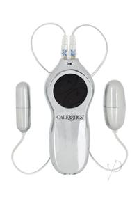 Powerful 7-function controller with 2 jacks Independent controls Controller 5 x 2/13 cm x 6 cm Standard silver bullet 2.25 x 1/6 cm x 3 cm Slimline silver bullet 2 x .5/6 cm x 2 cm ABS (controller) ABS with silver plating (bullets) 4 AA batteries