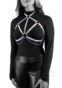 Dress up your assets with Cosmo`s stylish chest harness.andnbsp;Accented with rose gold nickel-free hardware and adjustable straps for the perfect fit. Made from easy to clean vinyl. Cosmo harnesses are available in a variety of styles and sizes.