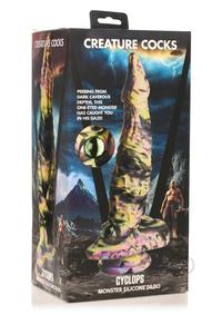 This Creature Cocks dildo comes from one of the many faraway lands of myth and fantasy. This yellow, pink and black rod has a tapered, textured shaft that is firm and flexible with a good amount of squish around the core so you push it deep into your sensual caverns. The serpentine-like body of this sexy shaft has a long, tapered head with ribbed shaft, popping veins, and an eye at the base. The vibrant green, glass cat-eye makes this Cyclops monster rod an intimate and mystical ride. Made out of premium, phthalate-free silicone it is body-safe and best used with water-based lubricants. The strong, suction-cup base allows you to enjoy hands-free rides when placed on any flat surface. It`s also harness compatible so you can strap it to your partner or to a chair or bench. To wash it simply rinse in warm water and mild soap, then spray with a toy cleaner before letting it air dry.The cyclops people only have one eye on their head, but where else do they choose to see from? Little known to most is how intimate and sexual the cyclops people are. In this fantasy realm you`ve fallen prey to the hungers of a cyclops. After stumbling into their cave, you became distracted by the wonders and treasures they kept hidden inside. The cyclops smelled you as soon as you entered their domain and their hunger began to grow with each passing minute that you lingered. The heat of the wet cave made you sweat and, as your sweat trickled down your chest and thighs, you felt your skin get wet and slick. The cyclops had its hands around your neck first. It knew how to immobilize you so you couldn`t get away. As it pulls you towards it, it breathes you in deeply and licks its lips. You`d heard horror stories about how the cyclops people eat travelers and you feared the worstandhellip; But then its other hand slips around and begins to lift the clothing from your body, turn you around, and look you up and down. Its smile makes you realize it likes what it sees, but nothing makes that clearer than its raging, hard shaft. That`s when you realize something else, something no lore had spoken of; the other eye gazes at you from above its shaft, wanting to take in every inch of you above and below. As it slips inside of you, making use of the humid air and your slick, wet body, you feel yourself convulse in pleasures you never knew before as the shaft moves in ways that feel foreign and exquisite. The cyclops takes you in as you take their shaft deep inside your body, a physical and visual blend of blissful sensations.Measurements:Overall length: 11.3 inches.Insertable length: 8.75 inches.Narrowest insertable diameter: 1.4 inches.Widest insertable diameter: 2.4 inches.Materials: Silicone, GlassColor: Yellow, Pink, Black Key Features:Fantasy Dildo: This Creature Cocks dildo has swirls of yellow, pink and black that camouflage it in its native land. The pointed, tapered tip makes insertion easy and the ribbed, textured shaft stimulates you with each stroke. One green, glassy cat-eye gazes up at you as you ride it!Strong Suction Cup: Enjoy hands-free rides with this strong, suction cup base that can be placed on any flat surface.Harness Compatible: Use it with a compatible harness for strapon or pegging play!Premium Silicone: Made out of premium, silky smooth, phthalate-free silicone it is soft and squishy on the outside while remaining firm on the inside. Use only with water-based lubricants.