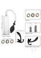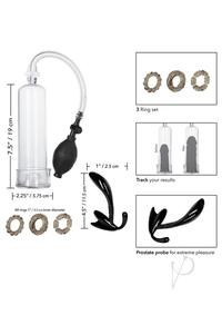 Kit Includes: Pliable and durable curved prostate probe for comfort and reach.3 sturdy, stretchy all purpose rings.Erection pump with flanged base for superior suction. Easy- squeeze bulb with quick air release valve.Removable body safe donut included for secure seal.Dimensions:Cylinder: 7.75 x 2.25 in.Probe: 4.5 x 1 in.Ring Diameter: 1 in.Package: 3.25 x 4.5 x 11 in.