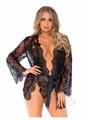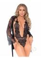 Leg Avenue Floral Lace Teddy with Adjustable Straps and Cheeky Thong Back Matching Lace Robe with Scalloped Trim and Satin Tie – Medium – Black