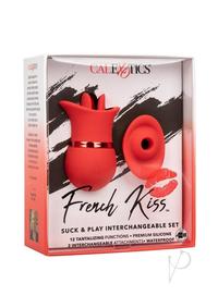 Twice the pleasure, oh la la! The sensual French Kissandtrade; Suck and Play Interchangeable Set knows just what you need with 2 interchangeable attachments with 12 functions of vibration or 12 functions of suction.The full contact scoop and fluttering triple tongue teaser have been crafted to perfectly contour to your most intimate pleasure points with 12 intense functions. Swap in the sensually contoured encaser and indulge in 12 functions of thrilling suction or indulge in a real French kiss with 12 functions of flickering action. The soft supple silicone and sensually contoured body let you deliver pinpointed pleasure from almost any angle.Use the easy-touch button to control up to 50 minutes of pleasure. Recharge up your pleasure in only 1 hour with the provided USB cable into the self-sealing charging port on the massager. The mini massagerandrsquo;s discreet size and travel-lock button make it the perfect travel companion, letting you embrace radiating pleasure wherever your fantasies take you.