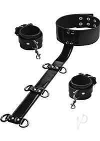 Confine your partner is this fully adjustable neck and wrist restraint system! Whether your play thing is wearing this set down their front or back, the removable cuffs can be moved onto any of the three D-rings on each side. Leave your lover trapped and expose as you pleasure them. The neoprene lining is comfortable and durable for long-term use with many repeats! The snap collar is easy to put on and remove quickly, and the buckle cuffs are elegant and will offer no escape! This vegan-friendly system is perfect for beginners and bondage enthusiasts alike!Measurements:15.5 inches in total length.Fits wrists from 7.5 to 10.5 inches.Fits necks between 14.5 and 17.5 inches.Material:andnbsp;PU Leather, Neoprene, Metal.Color:andnbsp;Black