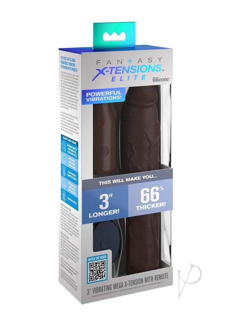 Instantly transform your penis into a pleasure machine with Fantasy X-tensions Elite! The 3andrdquo; Vibrating Mega X-tension with Remote is the first-of-its-kind where you can enhance your length/girth AND vibrate at the same time! Made from ultra-hygienic Elite Siliconeandtrade;, this performance-enhancement sleeve fits like a glove and feels like a second skin, giving wearers extra length, increased girth, and maximum confidence. Satisfy your partner and avoid embarrassing midway letdowns with your new secret weapon! Perfect for people with ED and performance anxiety, Fantasy X-tensions Elite enhancers will deliver results both partners will appreciate.Your silicone Fantasy X-tension Elite can be easily trimmed at the base for a perfect fit. Itandrsquo;s super-stretchy to accommodate most sizes and snug enough to help you last longer. Both partners will enjoy deeper penetration with the removable extenders, while the ultra-realistic sleeve makes the wearer 66% thicker all around. This could be you!KEY PRODUCT FEATURESandbull; 3 (7.6 cm) removable vibrating extender with remoteandbull; Extender and remote are USB rechargeableandbull; Adds up to 66% girthandbull; High quality Elite Siliconeandtrade;andbull; Lifelike textures andamp; detailsandbull; Trim for perfect fitandbull; Stretches to fit most sizesandbull; Perfect for people with ED