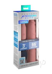 Instantly transform your penis into a pleasure machine with Fantasy X-tensions Elite! The 3andrdquo; Vibrating Mega X-tension with Remote is the first-of-its-kind where you can enhance your length/girth AND vibrate at the same time! Made from ultra-hygienic Elite Siliconeandtrade;, this performance-enhancement sleeve fits like a glove and feels like a second skin, giving wearers extra length, increased girth, and maximum confidence. Satisfy your partner and avoid embarrassing midway letdowns with your new secret weapon! Perfect for people with ED and performance anxiety, Fantasy X-tensions Elite enhancers will deliver results both partners will appreciate.Your silicone Fantasy X-tension Elite can be easily trimmed at the base for a perfect fit. Itandrsquo;s super-stretchy to accommodate most sizes and snug enough to help you last longer. Both partners will enjoy deeper penetration with the removable extenders, while the ultra-realistic sleeve makes the wearer 66% thicker all around. This could be you!KEY PRODUCT FEATURESandbull; 3 (7.6 cm) removable vibrating extender with remoteandbull; Extender and remote are USB rechargeableandbull; Adds up to 66% girthandbull; High quality Elite Siliconeandtrade;andbull; Lifelike textures andamp; detailsandbull; Trim for perfect fitandbull; Stretches to fit most sizesandbull; Perfect for people with ED
