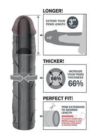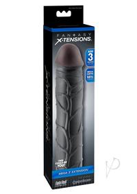 Turn your penis into an instant pleasure machine with the incredible Fantasy X-Tensions. Now you can be all the man you can be and satisfy your partner with this easy-to-use erection enhancer. Developed as a safe, affordable, non-surgical alternative to expensive medical procedures and pills, your Fantasy X-Tension will give you the biggest, thickest, most satisfying pleasure rod you ever imagined! Perfect for men with ED and midway performance problems, your new enhancer will deliver results that both partners will love!The Mega 3 Extension is a customizable extension that can be easily trimmed at the base for a perfect fit. It`s super-stretchy to accommodate most sizes and snug enough to help you last longer. Your partner will enjoy deeper penetration with the 3 extension at the tip, while the ultra-lifelike shaft makes you 66% thicker all around. The soft Fanta Flesh material feels just like a second skin, giving you the length, girth, and confidence you need to satisfy your lover.Cleanup is a snap after the fun with the included toy cleaner and warm water. One size fits most. This is not a condom.- 3 (76mm) Extension – Adds 66% Girth – Ultra-Lifelike Fanta Flesh – Trim for Perfect Fit – Phthalate-Free Item measurements: Length: 9(22.8 cm) Width: 2(5 cm) Inner diameter: 1.25(3.2 cm)