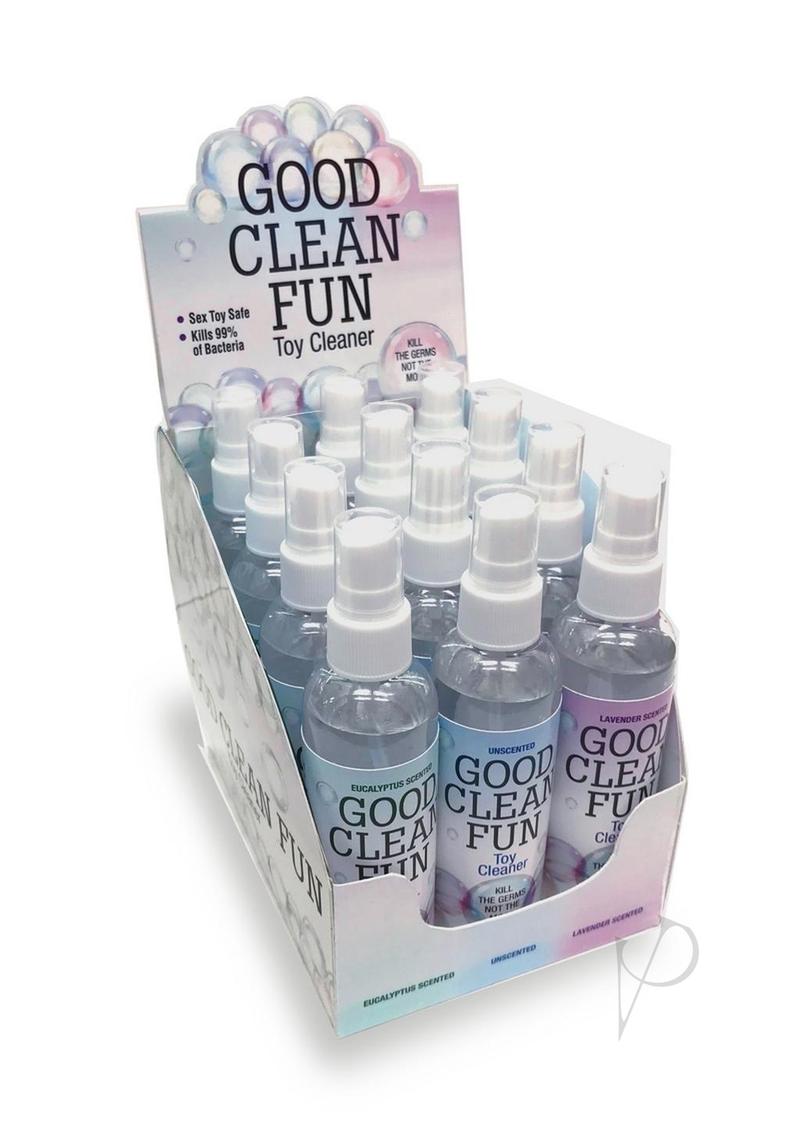 The 12- Piece POP Display is a great way to boost your impulse sales.This easy-sell add-on item will look great at your point of purchase.Good Clean Fun Toy Cleaner Spray is specially formulated to keep your personal pleasure products free of harmful germs and bacteria.Enjoy the lightly scented options of Lavender andamp; Eucalyptus or Unscented.Good Clean Fun is safe for all your personal pleasure products and should be part of your healthy cleaning regimen.