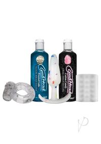 GoodHead makes oral better for both the giver and receiver. This Party Pack includes a Helping Head Ultimate BJ Helper, which is a small ULTRASKYN stroker designed for handheld use during fellatio and a one-size-fits-all disposable vibrating love ring to slide onto the shaft or over your palm. Also included is a beginner`s sized Silicone Confetti Anal Plug, Cotton Candy Oral Delight Gel, and Frosted Cake Slick Head Glide. Use them individually or together to have the ultimate oral experience.