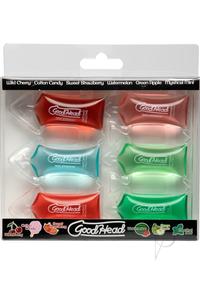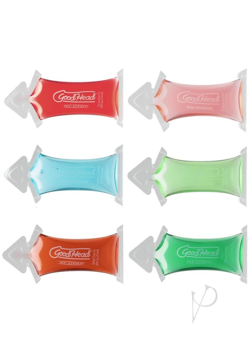 The secret to pure pleasure! Specially formulated to give you that extra boost for blow jobs of historical proportions! Just put your lips together and blow with Doc Johnson`s GoodHead Gel. Try for yourself and see how this edible blow job enhancer makes your foreplay unforgettable! This 6 pack includes GoodHead gel packed into portable pillow packs. Assortment includes Mystical Mint, Watermelon, Wild Cherry, Sweet Strawberry, Green Apple, and Cotton Candy.