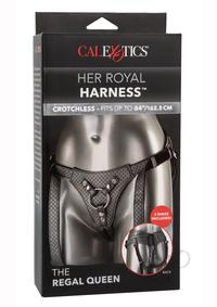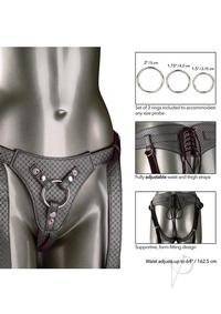 Prepare yourself for indulgent pleasure and premium probe play truly fit for royalty with The Regal Queen. The Her Royal Harness luxurious harness is made for a performance and comfort with a corset-like lace design, plush velvety lining and adjustable buckle enclosure. The bold crotchless design appeals to even the most dominant with the discreet snaps made to accommodate any size probe ring. The designer vegan leather, corset style details and plushy velvet liner give you the ultimate control over comfort.Dimensions:Waist Circumference: 64 in.Large Ring Diameter: 2 in.Medium Ring Diameter: 1.75 in.Small Ring Diameter: 1.5 in.Package: 2 x 5.75 x 11.25 in.
