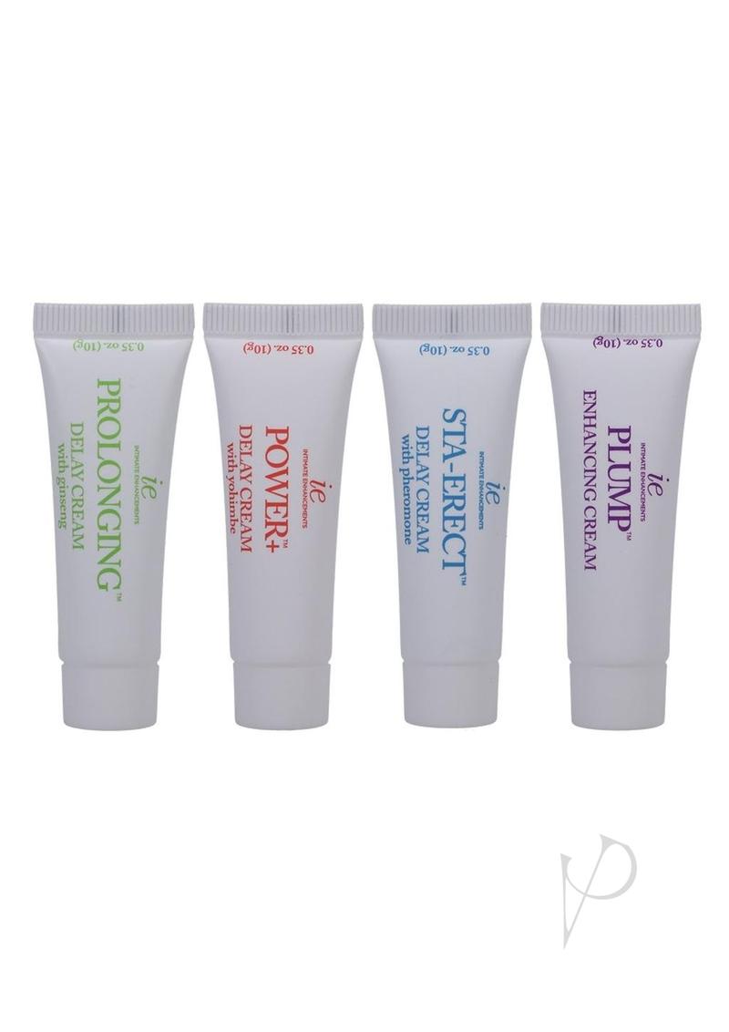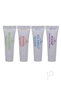 Keep the good times going with this pack of creams designed to keep you harder for longer. Included are four options. Plump is an enhancing gel that helps increase blood flow to the penis, which makes for a thicker, larger look and feel. Sta-Erect is a delay cream formulated with pheromone to boost sexual desire. Power+ delay cream is formulated with yohimbe, which provides increased circulation and blood flow. The Prolonging delay cream includes ginseng, a traditional aphrodisiac. All three delay creams will decrease penis sensitivity for extended play.