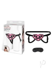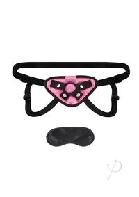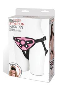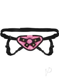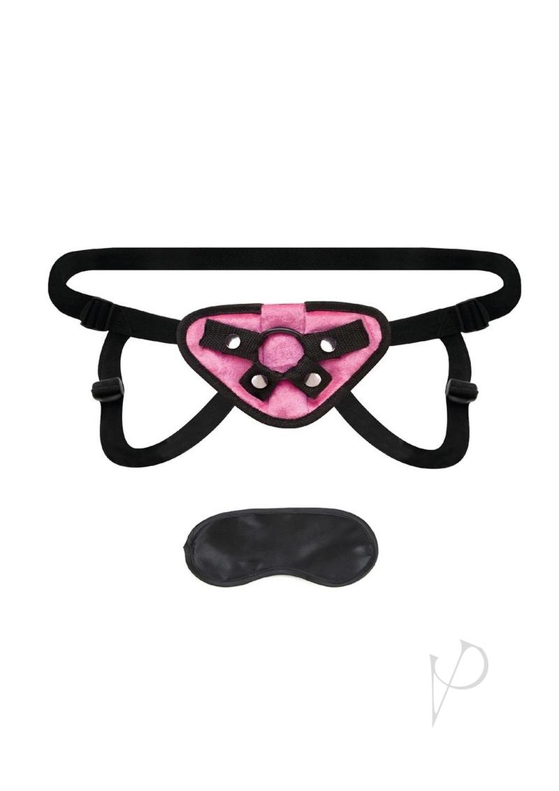 Give your partner the pleasure they deserve with Lux Fetish Pink Velvet Strap-On Harness. Features a comfortable secure harness in velvety fabric, 4 way adjustable straps that fit up to 60` hips, and a perfectly placed bullet vibe pocket for endless clitoral stimulation. This strap-on can accommodate any dildo with a flared base, and includes 2 rubber holder rings.