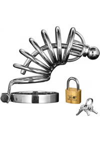 They will be compliant and under your control while wearing this devious chastity cage. Stainless steel and featuring a curved spine with enclosure rings and a removable cum-thru plug. Simply place him in the cage and fasten the base ring behind the testicles, then lock him up with the enclosed lock and key set. You decide when he is free…Set includes: 1 six ring cock cage, 1 base ring, 1 removable plug, 1 comfort hinge tube, 1 lock, 3 keys. The stainless steel material is non-porous, hygienic, easy to sterilize, temperature resistant, impact resistant, and offers long-term value.Measurements:Cage: 6 inches in total length, 1.3 inches in diameter.Urethral spout: 2.75 inches in length, 0.25 inches in diameter.Ring: 2 inches in diameterMaterial:andnbsp;Stainless SteelColor:andnbsp;Silver
