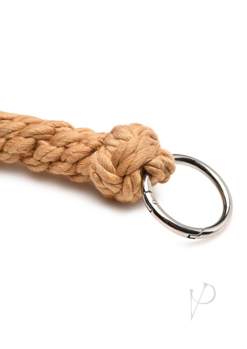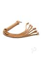 Take your impact play up a notch with this 6 tailed rope whip! Made of nylon, it is highly absorbent, durable and built to last! The knots on each end of the falls add an extra bite to each throw. Each fall is twisted so it stays tightly together and they are braided together along the handle. The firm handle keeps its shape with the help of a metal alloy core. Enjoy using this as a tool to give your lover a wicked little tap on the bottom when the flogging is paused. Easy to hold and to aim, this whip is great for beginners and advanced users alike! Due to its absorbent nature, it`s important to properly clean your rope after use, especially when it has come in contact with bodily fluids. Start by soaking the rope in a tub of water with mild detergent. Rinse using a rope washer or place directly into the washing machine. Washing rope in a top-loading washing machine is the easiest method.After you`ve gotten the consent of your submissive or partner, you place them against the bed, hands and head down and braced against the bed. Their backside is bare and their back is exposed to you. As you caress your body, you feel the heat rising from their skin. You begin to land a few strikes, caressing them in between and reminding them to breathe. Before long, you see the red marks appear and you touch their skin again. Their skin is hot where the marks are and there`s a wicked grin on their face. As you lean down towards them they whisper, Thank you. More, please!Measurements:Overall length: 25 inches.Tassels length: 17 inches.Materials: Nylon, Metal Alloy Color: Tan Note: Keep away from extreme heat or fire; synthetic rope will melt or fuse together. Key Features:Twisted Rope: These 6 twisted tassels of this Swashbuckler flogger are perfect for beginners or advanced users alike!Dispersed Impact: The knotted ends of each fall disperse in 6 different locations for impact play.Rigid Handle: The rigid handle has a metal alloy core that keeps it firm and easy to control when gripped in your hand.Detachable Ring: Use the detachable ring to hang up your flogger when not in use to preserve it`s form and quality.