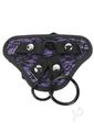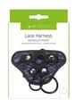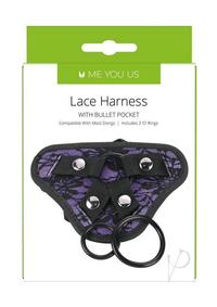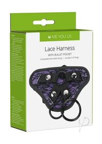 Me You Us Purple and Lace Adjustable HarnessEasy to adjust with hole in middleFor men or womenFits many dongsMaterials: Harness – 100% PolyesterColour: Black and PurpleSize:Ring1-diameter: 4.6cmRing2-diameter: 3.6cmHole-diameter: 4.6cm