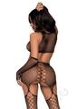 2 PC Net cut-out faux lace up garter dress with attached backseam stockings and matching gloves. O/S Black
