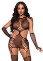Leg Avenue Net Cut-Out Faux Lace Up Garter Dress with Attached Backseam Stockings and Matching Gloves – O/S – Black