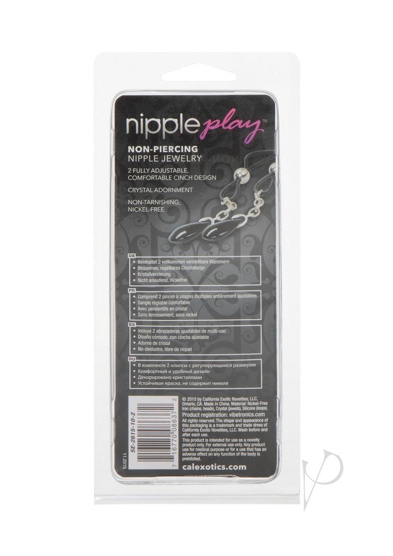 – Includes 2 fully adjustable nipple adornments – Soft and comfortable cinch design – Non-piercing, non-tarnishing, nickel-free – Nickel-Free Iron (chain, beads) – Silicone (loops) – Crystal (jewels) Size 2.25/5.75 cm (each loop) 4.5/11.5 cm (overall length)