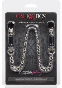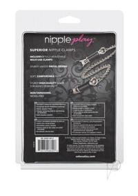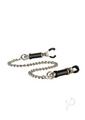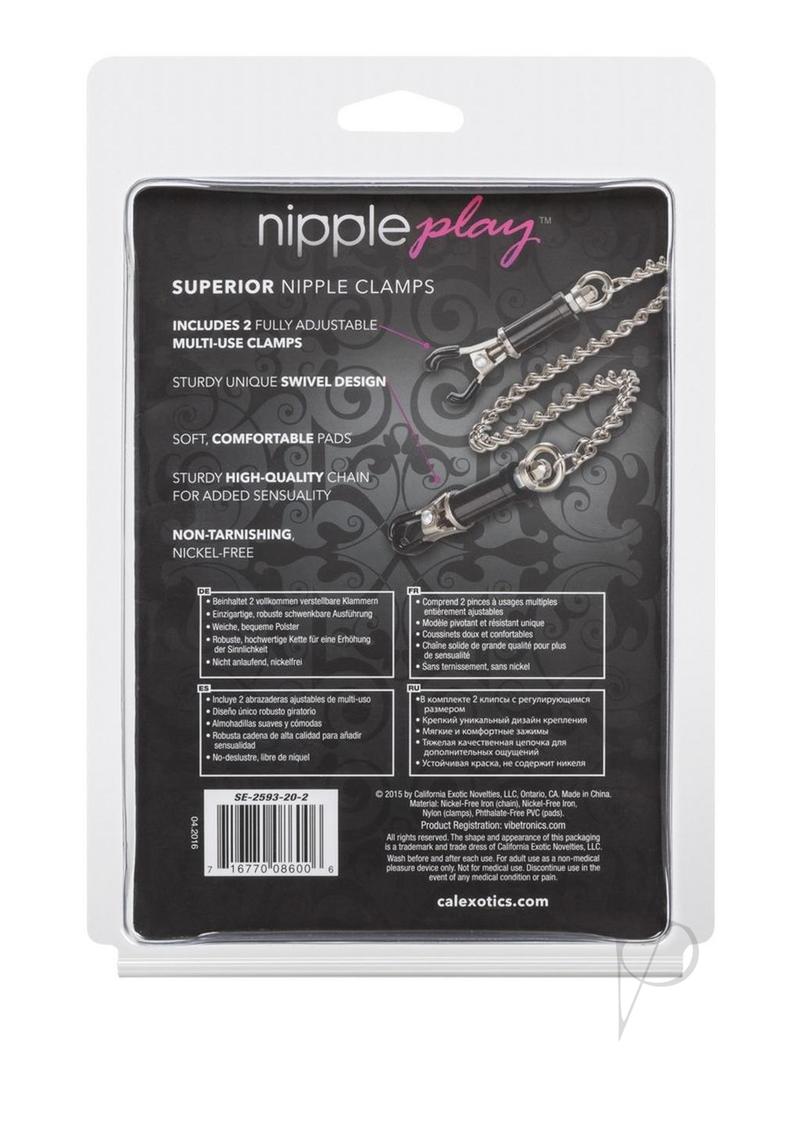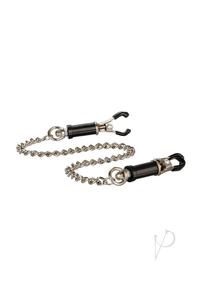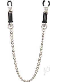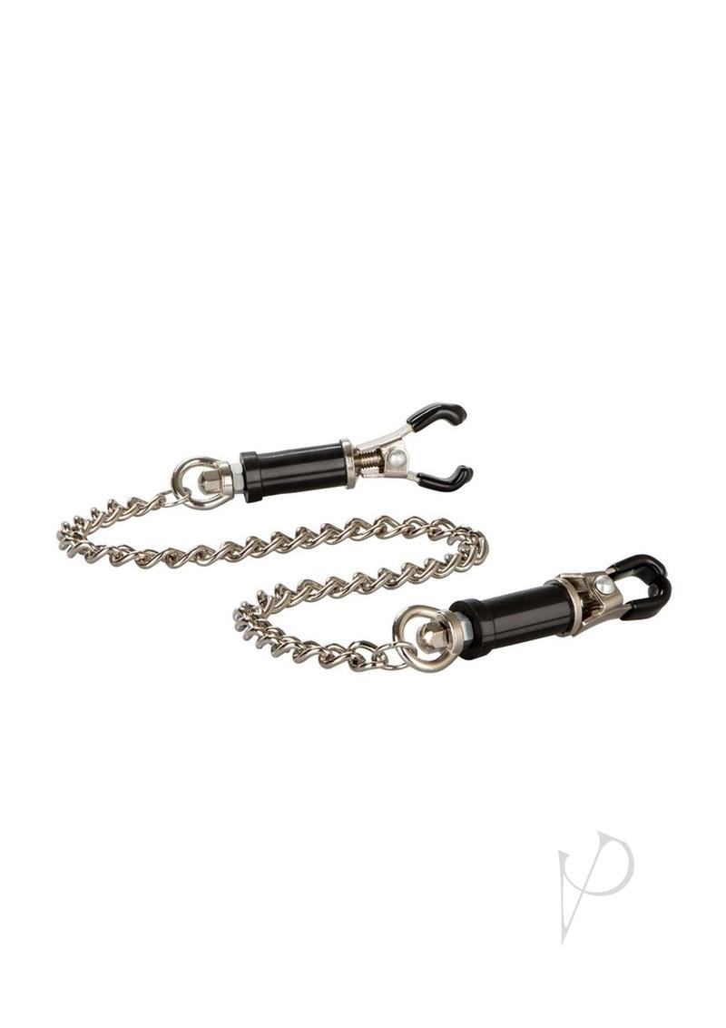 Includes 2 fully adjustable multi-use clamps Unique swivel design for customized tension Soft, comfortable pads Sturdy high-quality dual chain for added sensuality Non-tarnishing, nickel-free Nickel-Free Iron (chains) Nickel-Free Iron and Nylon (clamps) Phthalate-Free PVC (pads) 2.5 x .5/6.25 cm x 1.25 cm (each clamp) 19.25/49 cm (overall length)