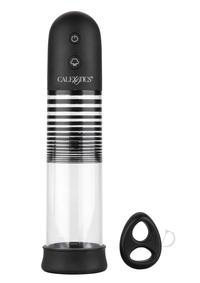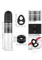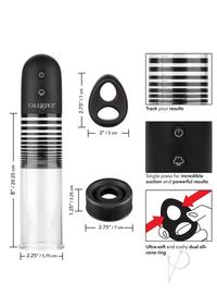 Rechargeable automatic pump with incredible suction at the push of a button Ultra-flanged base for secure seal Easy-grip controller for single-handed use Removable, body safe Silicone donut for comfortable use Quick air release button Clear cylinder with incremental measurements Easy push-button control Disassembles for easy cleaning Ultra-Soft and cushy dual Silicone ring help maintain andstrengthen erection Instructions included USB rechargeable – charging cord included Complete charge in 2 hours Total run time: 3 hoursDimensions:Cylinder: 8 x 2.25 in.Donut: 2.75 x 1.25 in.Ring Diameter: 1 in.Overall Ring: 2.75 x 2 in.