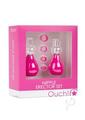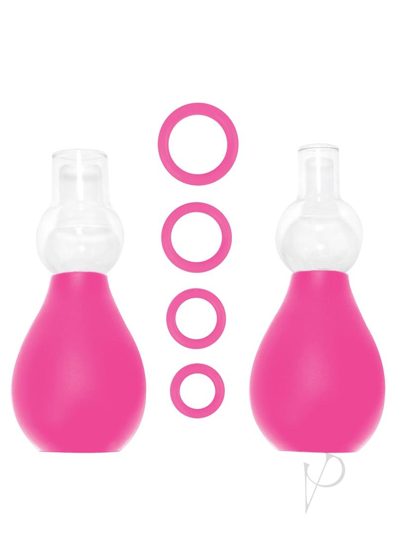 Keep your nipples stiff and sensitive with this nipple erector set and experience pumping pleasure! To start, take the pump with the smallest opening. Slide the rubber ring of your choice over the opening and place it on your nipple. Squeeze the air reservoir until you reach the desired result. Slide the rubber ring around your nipple to keep it hard and sensitive. Repeat these steps with your other nipple. To get the nipples even bigger, use the pump with the wider opening. Have fun!