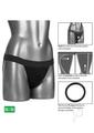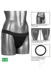 Discreet 2-panel design to accommodate dual penetration Reinforced O-ring stretches to accommodate most packers, dongs or probes Stretchy and comfortable with soft lining Internal strap to secure your packer in place (packer not included) Internal pockets to add a favorite stimulator (not included) Washable