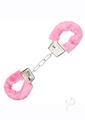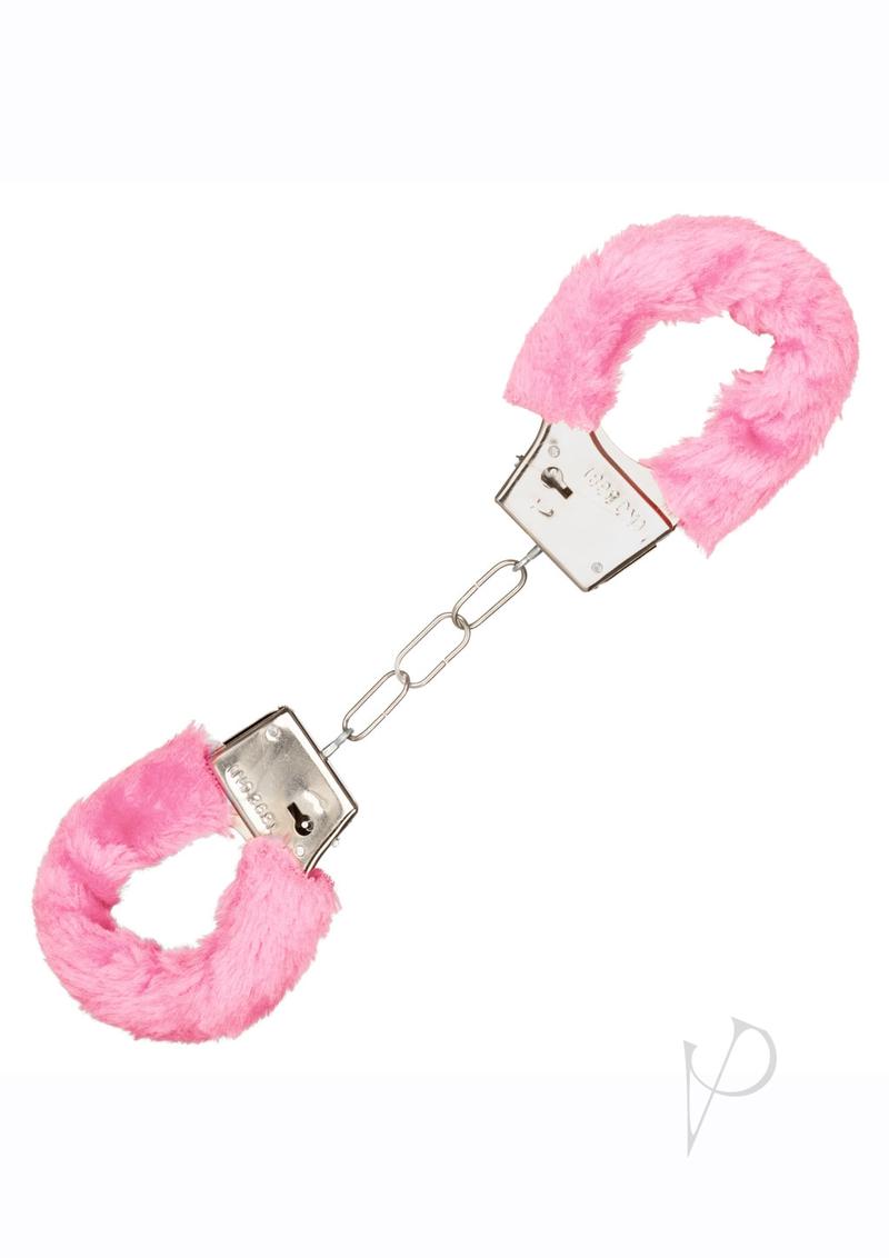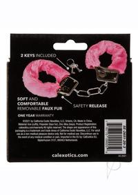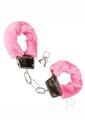 Metal faux fur covered handcuffs with safety release. Soft and comfortable removable faux fur. 2 keys included.