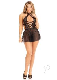 2 PC Plunging lace halter babydoll with sheer skirt and lace g-string. LARGE Black
