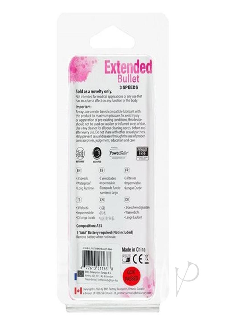 Say hello to the PowerBullet Extended Bullet – the 3-speed 3.5 pleasure product that allows you to put those powerful vibrations right where you want them.Whether itandrsquo;s for clitoral stimulation or a neck massage, PowerBullet Extended has as many uses as you need it to. Covered in a soft-coat finish, with three easy presses of the button you can quickly go from mild to wild. The mild vibrations are calm, yet deep and rumbly for beginners, while the wild vibrations are fierce and powerful for more seasoned Sexperts.PowerBullet Extended is small and discreet so you can take it anywhere. It is waterproof for fun in and out of the shower and tub.Key Features:3.5andrdquo; bullet vibrator3 speedsEasy one-press buttonSoft-coat finishWaterproofBody safeSmall and discreetNote: Do not remove the paper sleeve inside the battery compartment as it is needed for functionality.