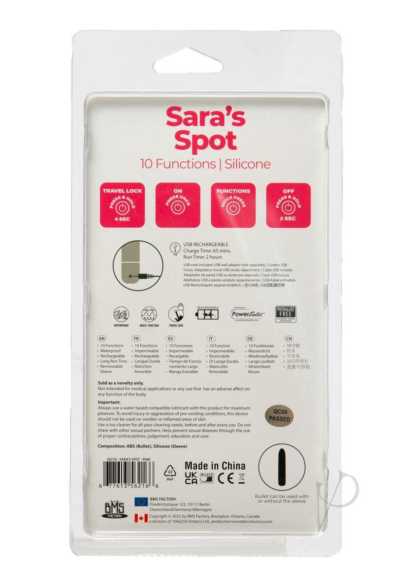 Experience Saraandrsquo;s Spot – the hotspot for all the wonders of a G-spot vibrator in a compact size that is so convenient you can bring with you anywhere!This 2 in 1 vibe features a 10-function vibrating bullet and removeable silicone sleeve.PowerBullet is known for their highly advanced motors that produce deep and rumbly vibrations, and Saraandrsquo;s Spot is no exception. With a simple press of a button, the ground-breaking vibrations transfer through the removeable sleeve to reach your desired areas.The sleeve itself is perfectly curved for G-spot stimulation that directly targets your sweetest spot.Press and hold the main button to activate travel lock. This ensures the bullet wonandrsquo;t randomly turn on, making it perfect for discreet travel.For play off of dry land, bring Saraandrsquo;s Spot into the bath tub or shower andndash; itandrsquo;s waterproof!Virtually seamless, the smooth finish and deep shine to the bullet and silicone material of the sleeve are nice to feel and look at, but also have body-safe advantages that allow you to use it on all your most delicate areas.Whether its for massage, couples or solos play, go to Saraandrsquo;s Spot for ultimate pleasure!Key Features:Compact G-Spot VibratorVibrating BulletRemoveable Silicone SleevePerfectly Curved for G-spot Stimulation10 FunctionsTravel LockWaterproofBody-SafeRechargeableDimensions (bullet with sleeve on):Length: 5andrdquo; (12.7 cm)Insertable Length: 4.2andrdquo; (10.9 cm)Shaft Diameter: 1.1andrdquo; (2.9)Width: 1.6andrdquo; (4.3cm)