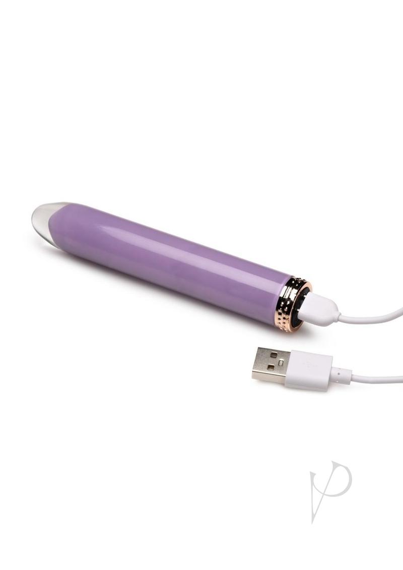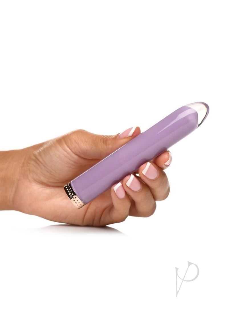 With this classy, glassy bullet vibrator you get the sexiest buzz around! With its unique purple color, the slightly pointed, round tipped end, and a golden ring at the base, it is elegant and sexy! This long, durable, borosilicate glass vibe is non-porous and compatible with any lubrication type. The super smooth glass feels amazing against your skin and within the bullet vibrator is a motor that delivers 3 speeds and 7 patterns of powerful buzzing vibes! Enjoy it in the bedroom or take it into the shower, too! Rated as IPX5 it is splashproof and waterproof to low powered jets. Do not submerge. To clean, simply rinse with warm water and wash wild mild soap. Then spray with a toy cleaner and wipe dry. Recharge via the magnetic of the USB cable provided.Use some lube and rub it on yourself and the toy. Avoid using lube on the base where the control buttons are. Then turn it on and start to massage your erogenous areas such as your nipples or below the waist. The powerful buzzing vibrations will start to warm you up and excite you! Use the pointed end to get more specific areas or use the entire shaft and enjoy the buzzing rumbles across a wider area! Ride the vibrations to climax, share it with a partner and enjoy!Measurements:Overall length: 4.6 inches.Insertable length: 4.25 inches.Widest diameter: 0.8 inches.Materials: Borosilicate Glass, ABS Plastic, Silicone (Power Button)Color: PurpleNote: Use with water-based lubricants for best results. Do not submerge in water. Do not insert anally.Key Features:Borosilicate Glass Bullet: This durable, sleek glass encases a powerful vibrator and is compatible with all lube types! It has a slightly pointed, round tipped end.Powerful Vibration: Choose between 3 speeds and 7 patterns of vibration.Rechargeable: Recharge using the magnetic end of the USB charger.Splashproof: Rated as IPX5 waterproof so it can handle low powered jets and be taken into the shower, but not submerged.