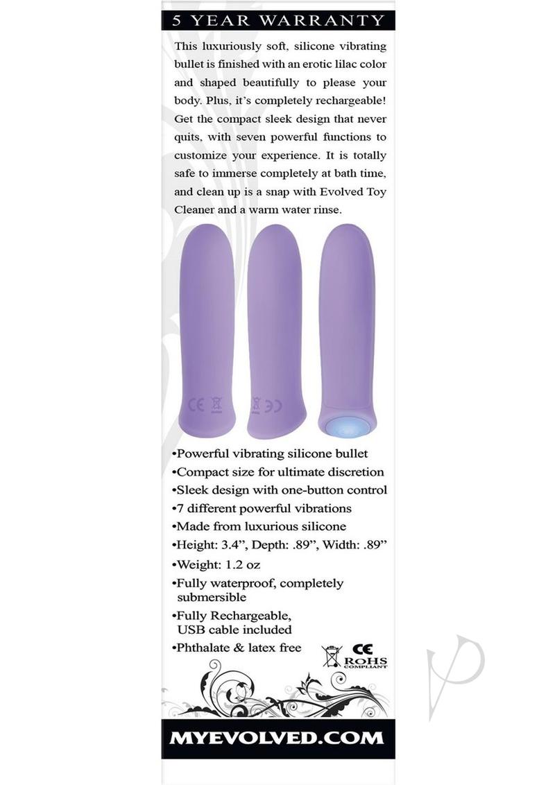 This luxuriously soft, silicone vibrating bullet is finished with an erotic lilac color and shaped beautifully to please your body.Plus, it`s completely rechargeable!Get the compact sleek design that never quits, with seven powerful functions to customize your experience.It is totally safe to immerse completely at bath time, and clean up is a snap with Evolved Toy Cleaner and a warm water rinse.Powerful vibrating silicone bulletCompact size for ultimate discretionSleek design with one-button control7 different powerful vibrationsFully waterproof, completely submersibleFully rechargeable, USB cable includedPhthalate and latex freeDimensions:Height: 3.4 in.Depth: .89 in.Width .89 in.