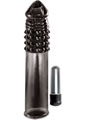 An easy to use textured extension sleeve that vibrates!- 3.5 inches added- Super stretchy- Fits most men- Ribbed texture- Removeable bullet- Variable speed- Materials: Sleeve TPE, Bullet ABS- Sleeve size: length 7.5, Diameter 2- Bullet size: length 2.25, Diameter 2- 3 LR44 (AG13) Batteries included