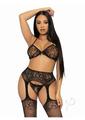 3 PC Rhinestone lace bra top, g-string, and fishnet garter belt stockings. O/S BLACK