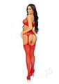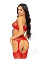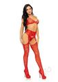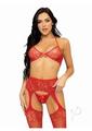 Leg Avenue Rhinestone Lace Bra Top, G-String, and Fishnet Garter Belt Stocking (3 Piece) – O/S – Red