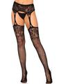 Rhinestone lace top fishnet stockings with lace foot and attached garter belt. O/S BLACK