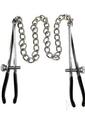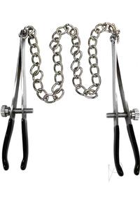 Nipple Chain Clamps. A pair of quality steel nipple chain clamps. Sturdy link chain with a screw to adjust the tightness. With black rubber on the tips for better grip.