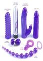 Let purple reign! The Royal Rabbit Kit includes seven magnificent items of pure gratifying pleasure. The multi-speed, silver vibe and two sleeves will satisfy your deepest yearnings. Try the translucent dong for the feel of realistic sexual enjoyment. Place the textured cockring on your lover and the sensation will tickle and excite your vagina and clit with each thrust. The graduated anal beads bring erotic taboo excitement while the thrill balls can tantalize your vagina or anus for a little something different.