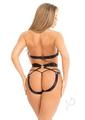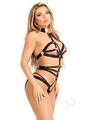 Satin elastic O-ring crotchless teddy with adjustable straps and rose gold lock and key choker. O/S Black