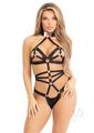 Leg Avenue Satin Elastic O-Ring Crotchless Teddy with Adjustable Straps and Rose Gold Lock and Key Choker – O/S – Black